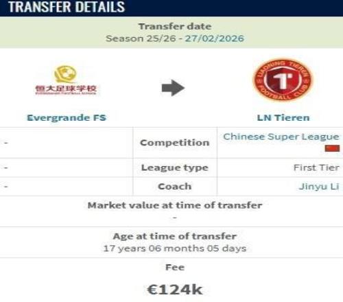 北京时间2月27日,德转更新,辽宁铁人约100万人民币签下恒大足校17岁后卫张洪福。