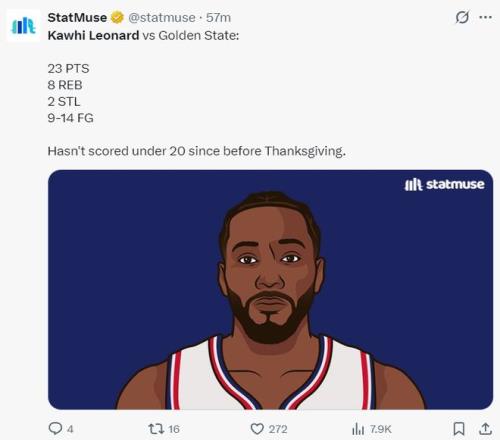 此役伦纳德还完成连续38场比赛20+创造职业生涯新高,这也是快船队史第二长,最长的是74-75赛季的鲍勃-麦卡杜44场,本赛季伦纳德就有希望打破这项纪录。
