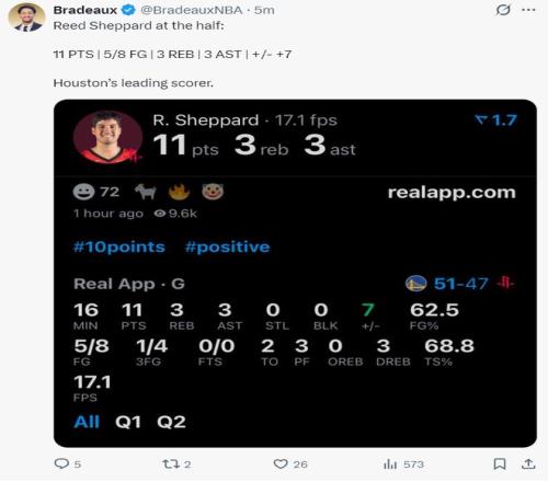 第三节的谢泼德依旧炸裂,单节拿到7分,三节已经拿到18分4助攻3篮板,杜兰特三节拿到15分4篮板2助攻,阿门三节17分6篮板2助攻,申京三节拿到8分7助攻6篮板,火箭在第三节打出35-30完成了反超。