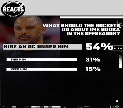 美媒《sbnation》发布的火箭球迷投票中也直观展现出这一点,有54%的人认为火箭需要为乌度卡增加一名进攻助教,也有31%认为应该直接解雇乌度卡。