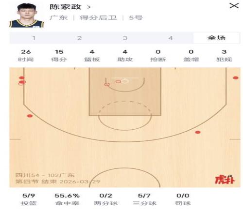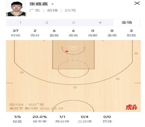 在众多轮换球员中,张皓嘉成为焦点。他首发出战37分58秒,全场5投1中,三分4投全失,仅得2分,却贡献6篮板、6助攻、1抢断,正负值高达+49,为全队最高。这一数据引发巨大争议:一方面,他攻防两端的投入度被教练组高度认可;另一方面,其低效的进攻表现与替补席上陈家政(26分钟9投5中,15分)形成鲜明对比。