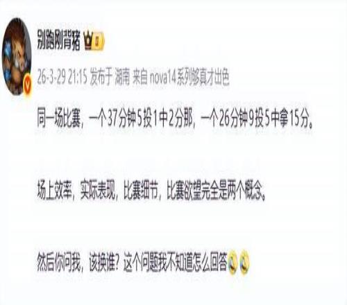 然而,广东媒体人“别跑刚背猪”在社交平台公开质疑:“同一场比赛,一个37分钟5投1中2分那,一个26分钟9投5中拿15分。场上效率,实际表现,比赛细节,比赛欲望完全是两个概念。然后你问我,该换谁?这个问题我不知道怎么回答。”这一质问直指教练组用人逻辑。表面上看,陈家政的效率数据碾压张皓嘉;但若仅以得分论英雄,将忽略篮球运动中“非数据贡献”的真实价值——如防守压迫、掩护质量、轮转速度与精神属性。