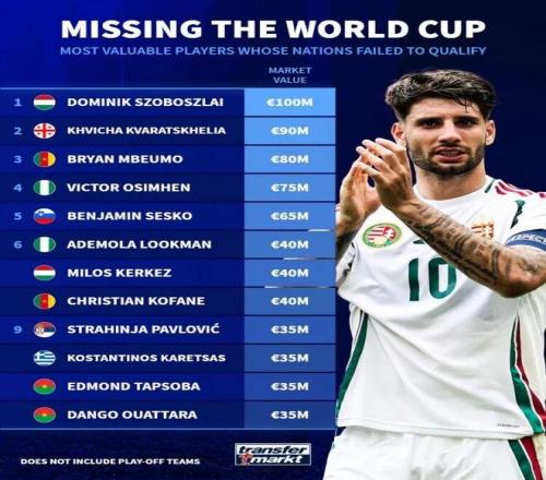世欧预附加赛进入决赛阶段,德转官方统计无缘今夏世界杯身价最高的球员。匈牙利当家球星、利物浦中场索博斯洛伊以1亿欧领衔。