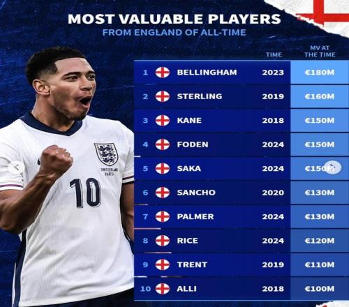 北京时间3月31日,德转列出了英格兰球员历史身价榜,贝林厄姆1.8亿欧元第一,斯特林1.6亿欧元第二,哈里-凯恩、福登、萨卡同以1.5亿欧元并列第三。
