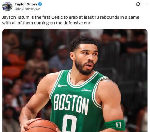 凭借这样的表现,塔图姆成为凯尔特人队史首位单场抢下18个篮板且都是防守篮板的球员。