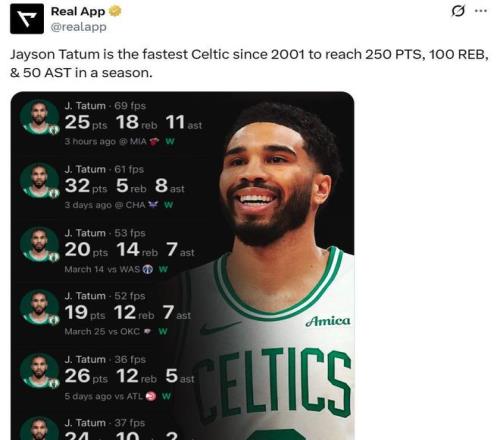 正是凭借这样的球风特点,塔图姆本场比赛拿下三双后,成为凯尔特人01年至今达成单赛季250分100板50助最快的球员。