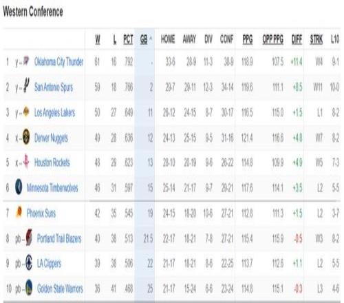 湖人50胜27负只领先掘金1个胜场,领先火箭也只有2个胜场,加上湖人的东契奇常规赛报销了他们常规赛的战绩下滑也很有可能,掘金、火箭是有可能反超湖人的,那么就是掘金第三、火箭第四、湖人第五。