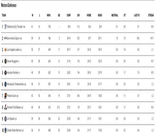 西部的格局是分档次的,第一档:雷霆、马刺;