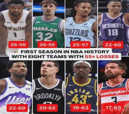 4月14日,美国媒体ESPN公布一则数据,NBA在本赛季首次出现有八支球队输掉至少55场比赛,同时有八支球队胜率不足33%。