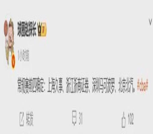 特别值得一提的是,已经确定广东队无缘本赛季常规赛前四。前四球队分别是上海队、广厦队、深圳队和北京队。