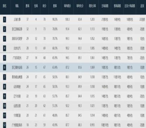 上海队当前战绩为37胜4负高居联盟第一,排在后面的是卫冕冠军广厦队(32-9)、深圳队(29-12)、北京队(28-13)、广东队(27-14)、浙江队(26-15)、青岛队(24-17)、山东队(24-17)、辽宁队(22-19)、山西队(21-20)、宁波队(20-21)和广州队(18-23)。