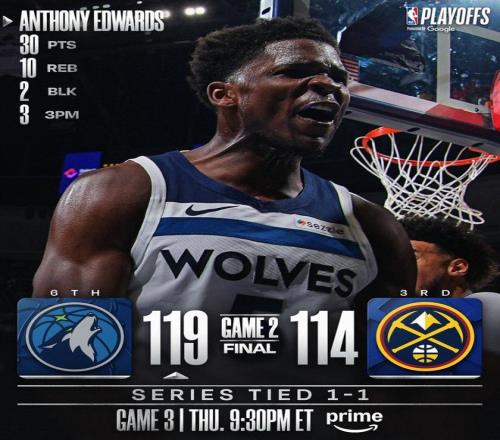 兰德尔2罚全中,穆雷单打戈贝尔中投不进,迪文琴佐暴扣,明尼苏达锁定胜局。穆雷远投不进,比赛时间走完。最终,森林狼以119比114险胜掘金,上演了19分大逆转好戏。明尼苏达将大比分改写为了1比1平,双方的G3对决将在森林狼主场进行。值得一提的是,森林狼19分逆转是季后赛队史第二大。